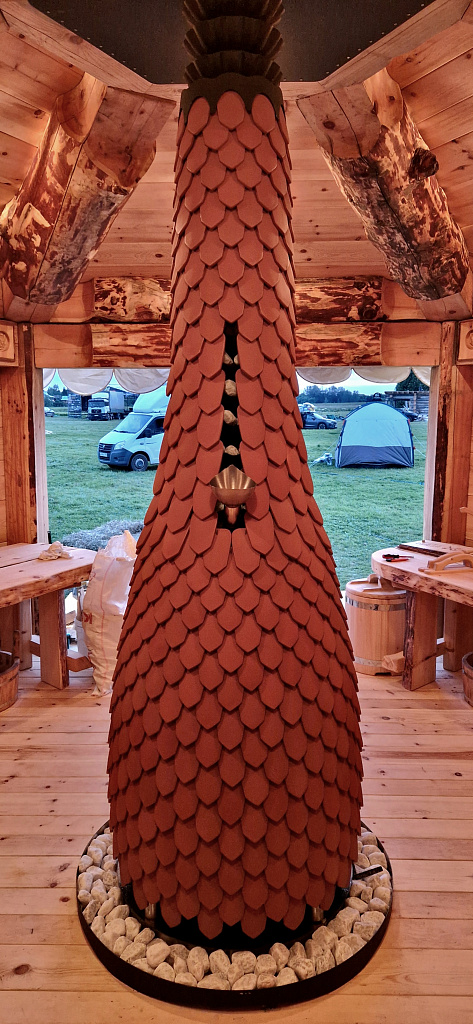 Первое, что бросается в глаза — эта печь огромна, потому что предназначена для очень больших парных. Также она крайне необычна по форме, поскольку объёмы топки и дымохода в ней соединены воедино, а все её поверхности — бионические.